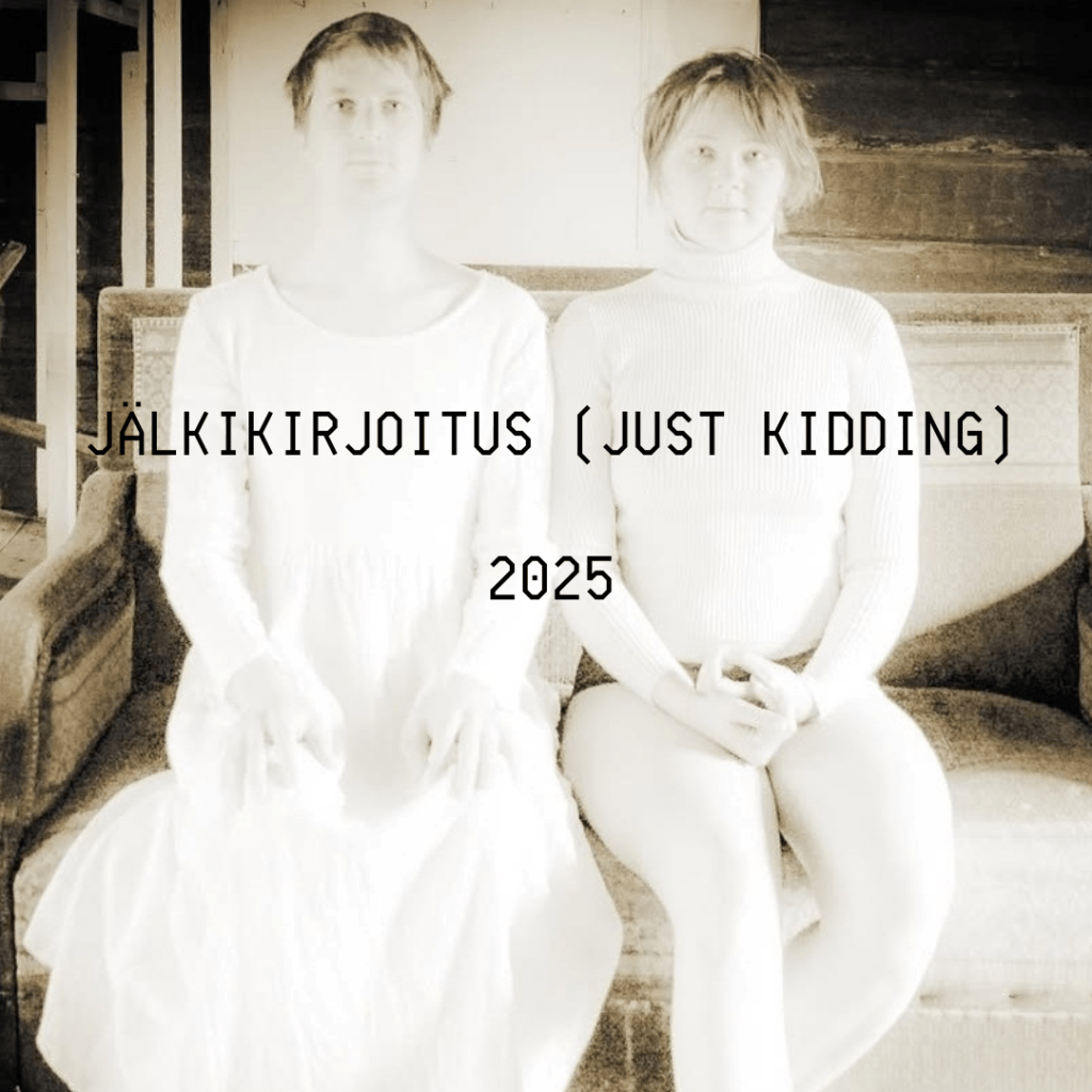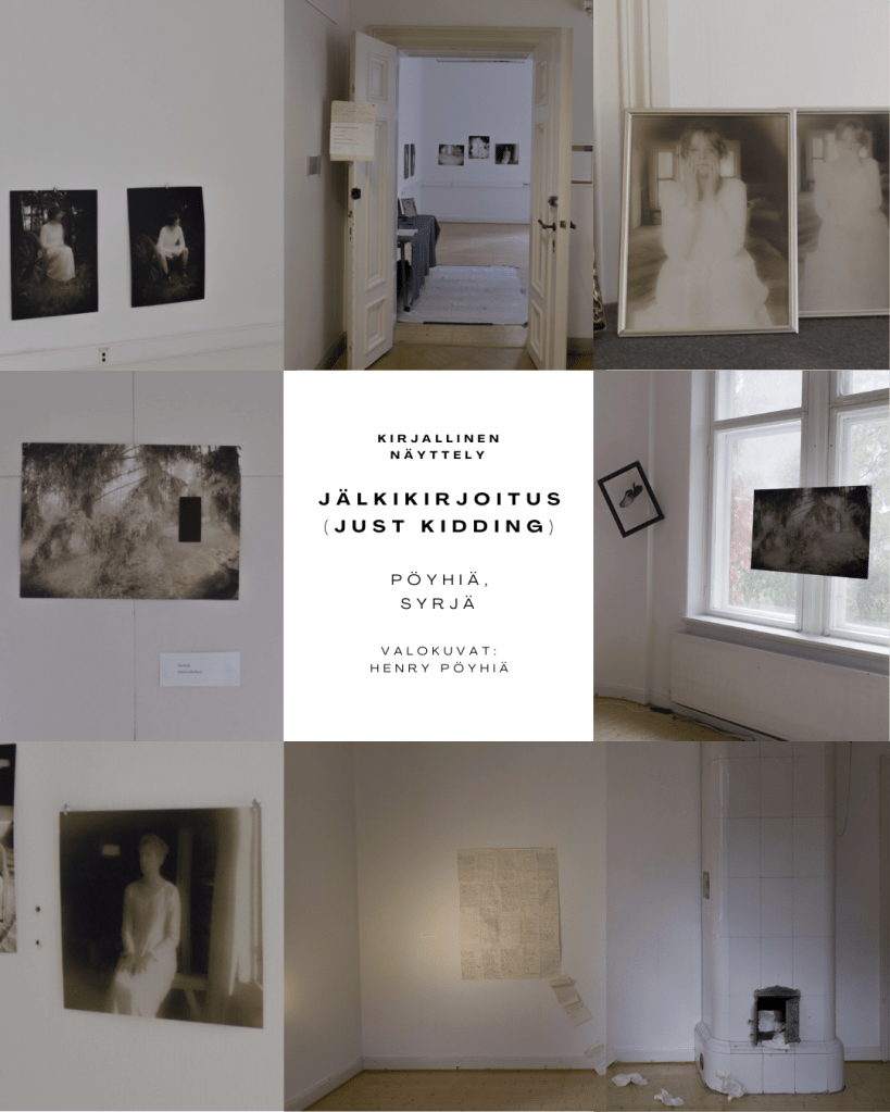 JÄLKIKIRJOITUS (Just Kidding)” sai alkunsa kysymyksestä “mitä jos me, Iiris ja Henry, olisimme eläneet 1800-luvulla ja ystävystyneet silloin?” Teos on historiantulkinnan ja identiteetin kanssa leikittelevä kirjallinen näyttely, jossa kirjoitimme vaihtoehtoisia omakuvia ja elämäntilanteita, jotka liikkuvat autofiktion ja pseudohistoriallisten maailmojen välillä.