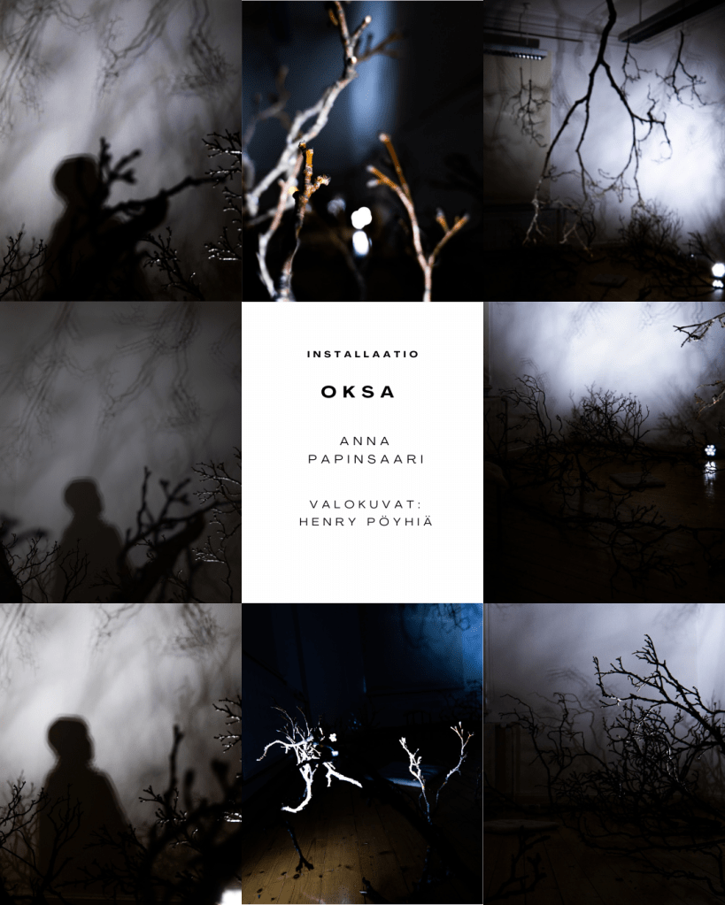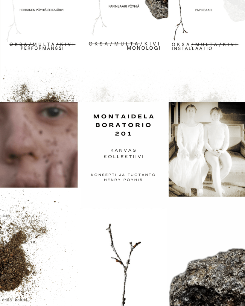 Monitaidelaboratoriossa nähtiin neljä yleisölle avointa kokonaisuutta; kirjallinen näyttely Jälkikirjoitus (JUST KIDDING) sekä saman teeman alla liikkuva teoskokonaisuus OKSA/MULTA/KIVI, joka käsitteli eri esitystaiteen keinoin (performanssi, esitys ja installaatio) inhimillisen ja ei-inhimillisen olion välistä suhdetta. Jälkikäteen tarkasteltuna kokonaisuus paljasti itsensä kysymyksenä siitä, että miten ja millaista kulttuuria syntyy maailmassa, jossa ihminen ei voi enää kuvitella olevansa luonnon hallitsija.