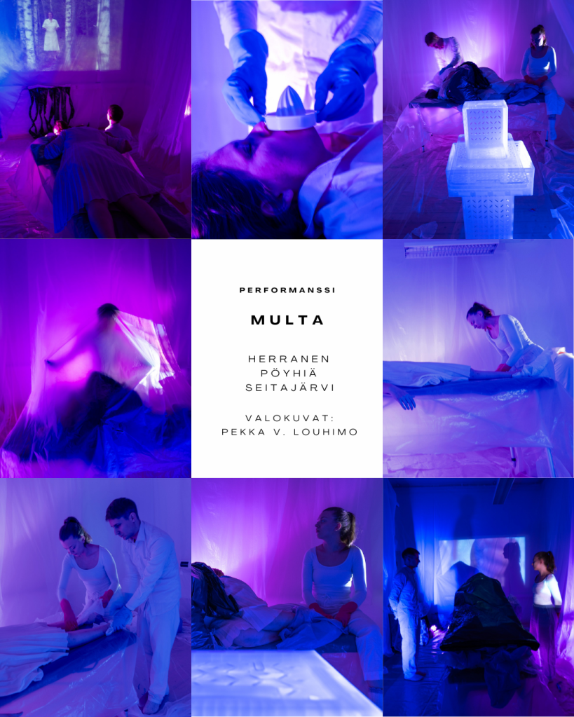 MULTA on performanssikuvaelma keskellä arkista ekokriisiä. Teos avautuu absurdina, terapeuttisena istuntona, jossa muovisessa todellisuudessa elävä ihminen yrittää löytää rauhaa teknologiasta ja luontokuvitelmista, yrittäen päästä takaisin maayhteyteen.