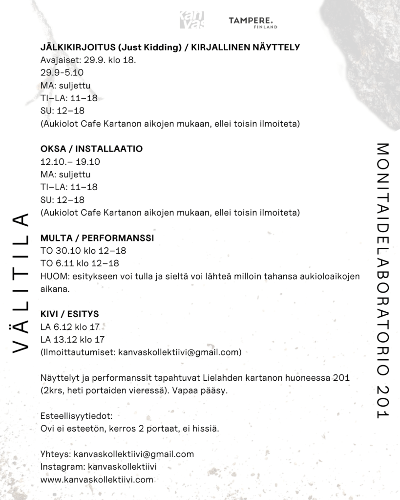 Kanvas Kollektiivi toimi Tampereen kaupungin mahdollistamassa välitilassa loppuvuonna 2025. Lielahden kartanolla sijaitseva huone 201 muuntui Monitaidelaboratorio 201:ksi jonka keskiössä oli tutkia monitaiteellista praktiikkaa esittävien- ja esitystaiteiden näkökulmasta. Tilassa toteutettiin yleisölle avoimia work-in-progress tapahtumia, joissa pääsi tutustumaan työn tuloksiin.